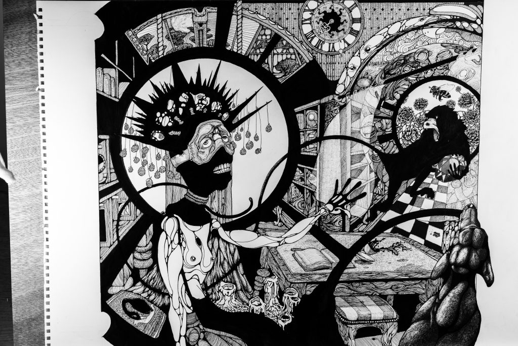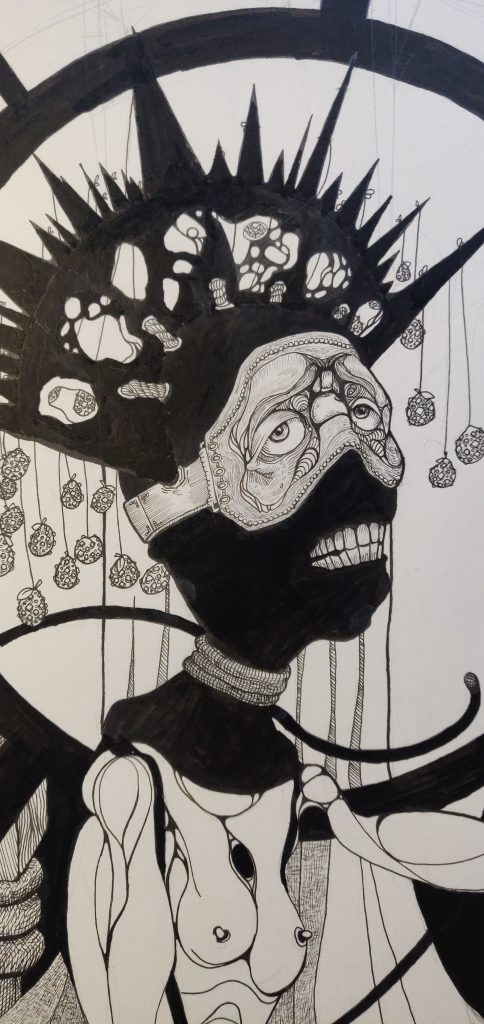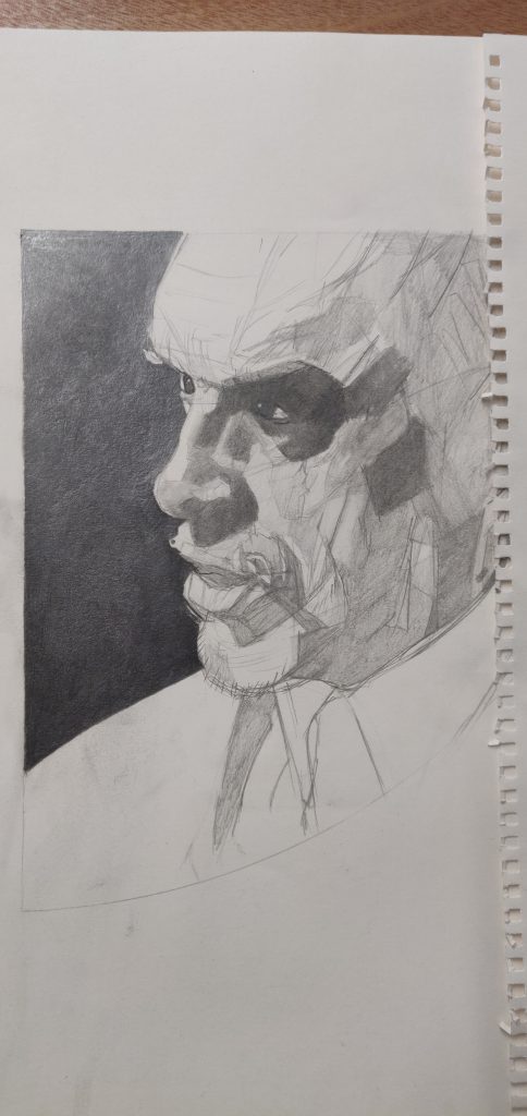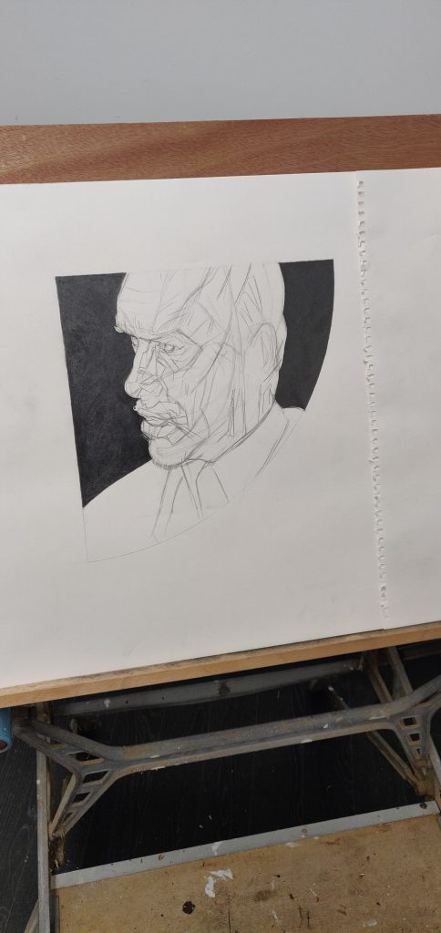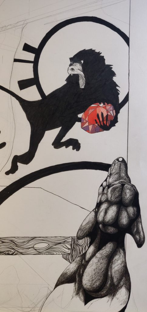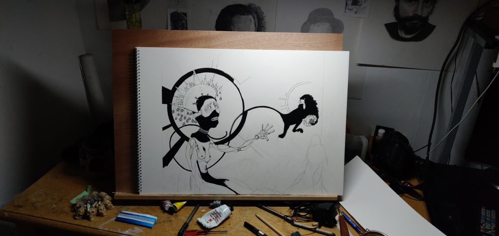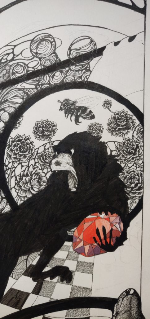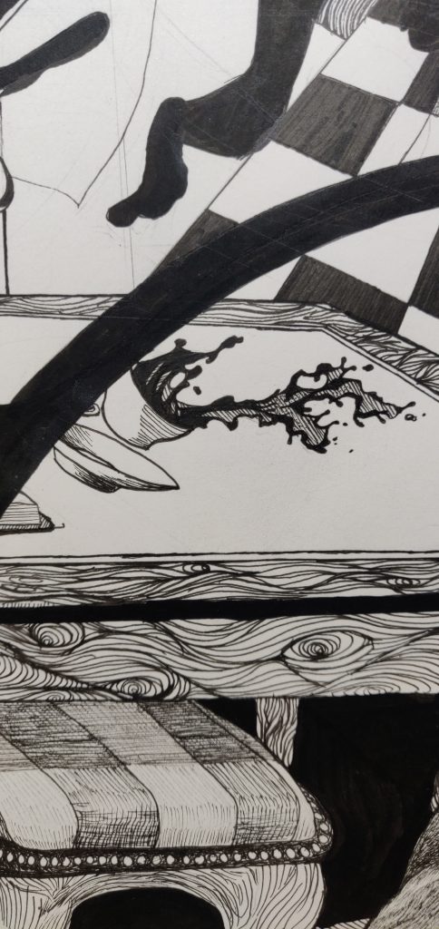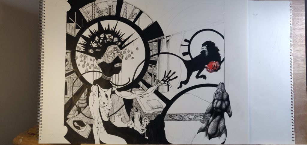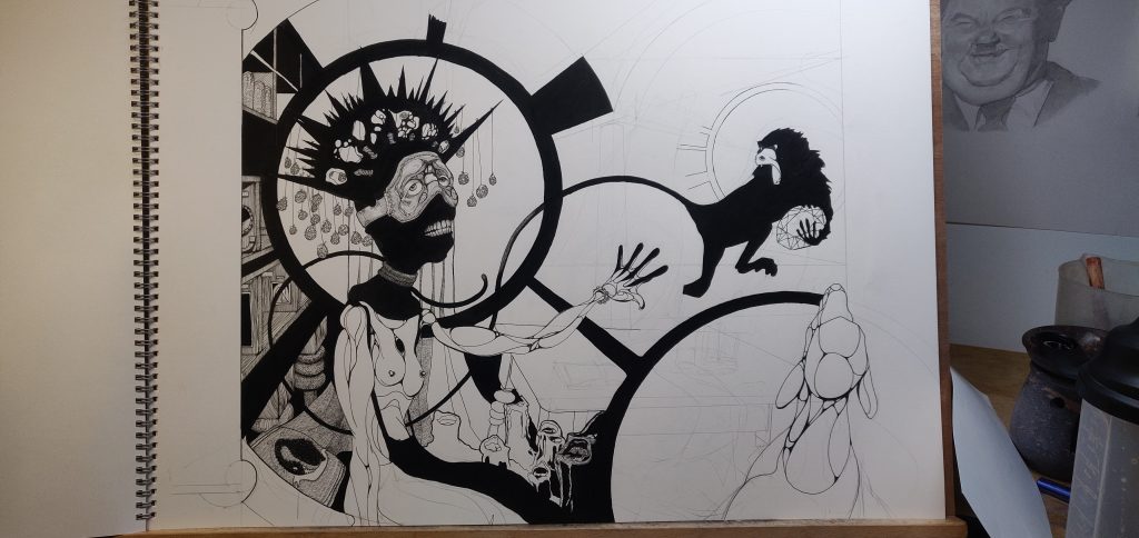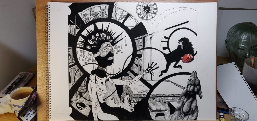 I had been trying some marbling recently and it reminded me of an old sketchbook page that I had kept a hold of meaning to turn into something. So I’ve scanned it and coloured it, I might go into the black lines and draw out some contours, or add some shading to the coloured areas to bring them forward from the intersecting dark lines, or both.